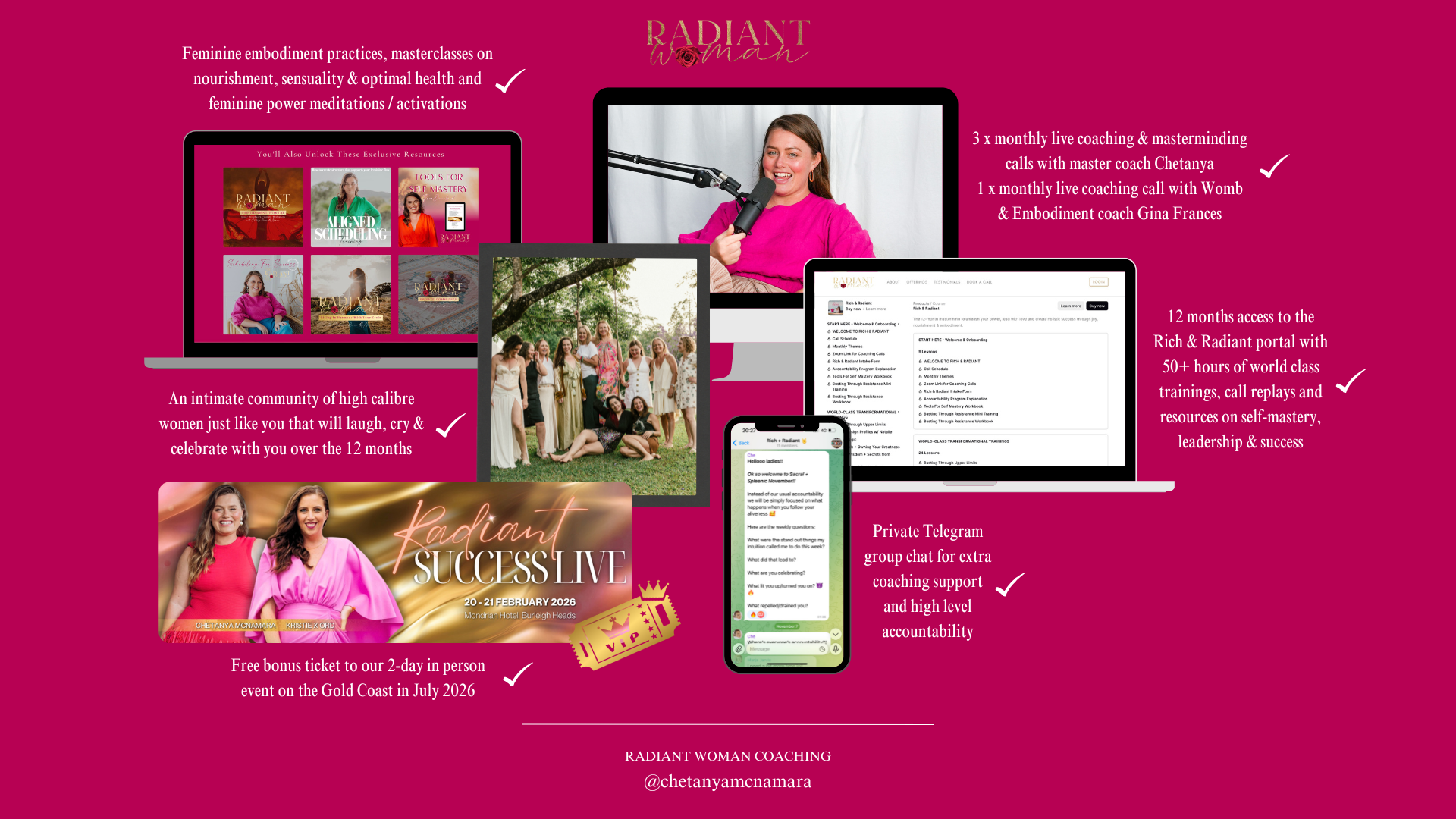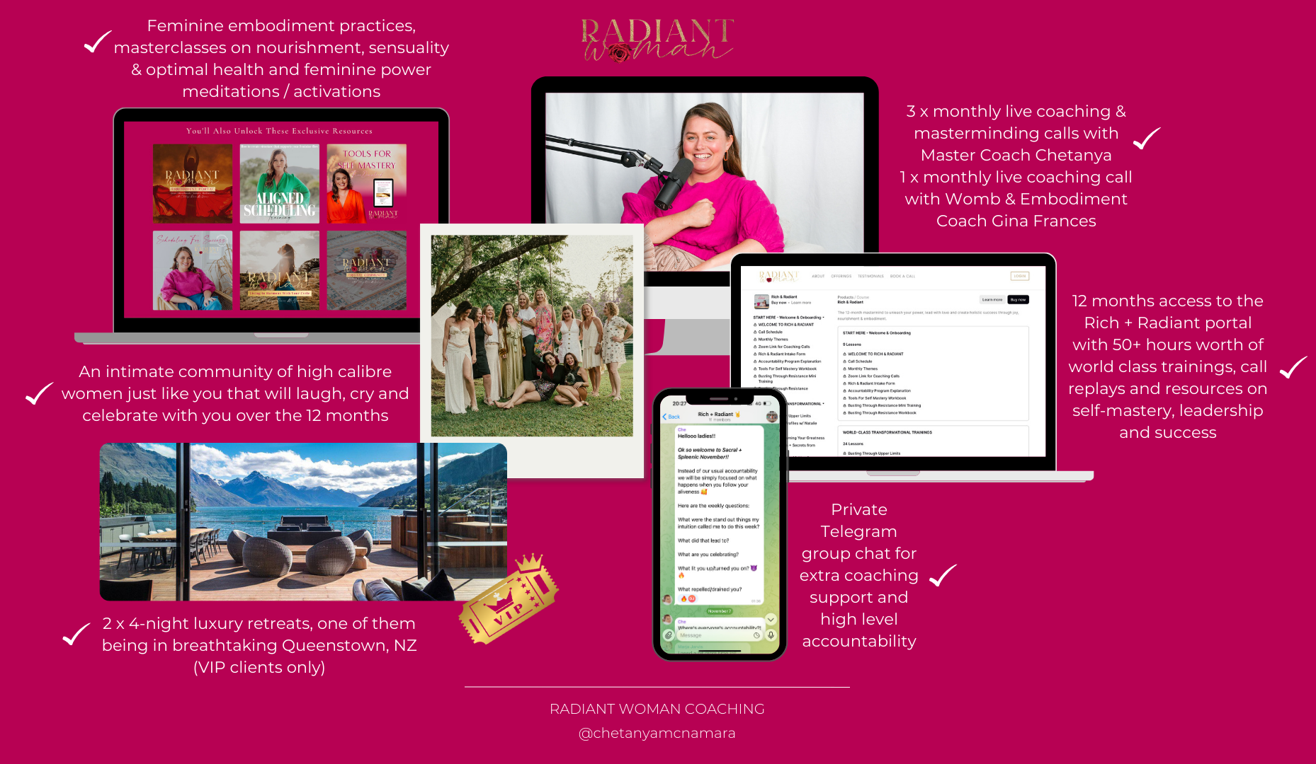 12 months access to the Rich + Radiant portal with over 50+ hours worth of world class trainings, call replays and resources on self-mastery, leadership & success.